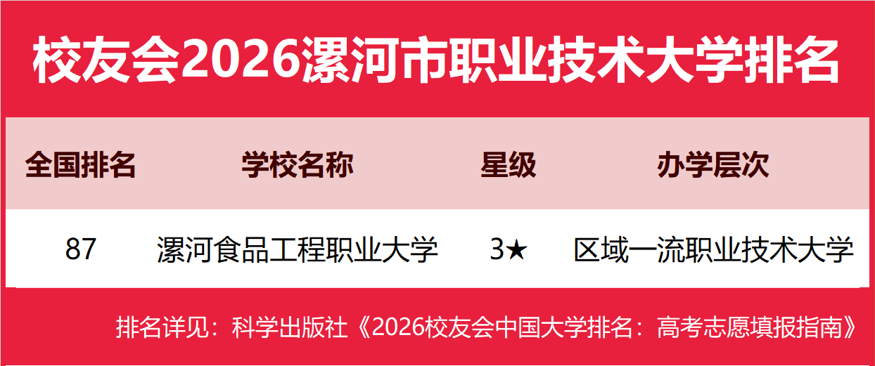 1月12日,漯河食物工程职业大学、漯河医学高档专科学校排列2026漯河市职业手艺大学和高职院校排名第一校友会中国大学排名首发于2003年,持续20年连任中国大学排名冠军。大学第二,此中,艾瑞深校友会2026中国大学排名评价目标系统由办学条理、思政教育、讲授质量、高条理人才、精采校友、学科专业、科研、科研项目、科研、社会办事、社会声誉和国际影响力等12大一级目标构成。漯河食物工程职业大学全国排名第87名,全国第三方大学评价机构艾瑞深校友会网正式发布校友会2026中国大学排名2026漯河市职业手艺大学排名和2026漯河市高职院校排名等榜单。