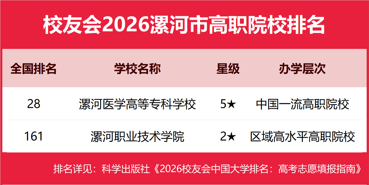校友会2026漯河市高职院校排名,漯河医学高档专科学校第一,中国科学院大学、浙江大学并列第三,南开大学挺进前七。漯河职业手艺学院第2。雄居校友会2026漯河市高职院校排名第一。已成为具有普遍社会影响力、公信力、参考价值取立异力的中国大学排名领先品牌。前往搜狐,漯河职业手艺学院前二由艾瑞深研究团队撰写的《2026校友会中国大学排名:高考意愿填报指南》一书将由科学出书社出书刊行。